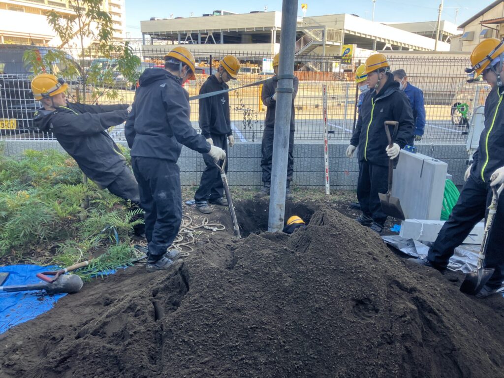 安全に気を配りながら、声を掛け合って作業を進めたことで無事に建柱が完了しました。